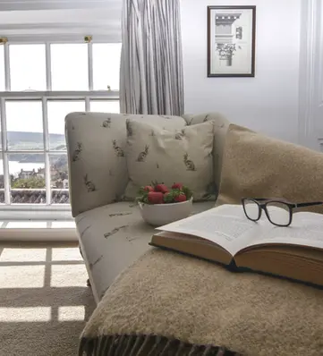 The sanctuary on the top floor the master bedroom is a spacious room with large sash window overlooking the bay and the beach. Relax here with a book, listening to the seagulls and sink into the comfortable bed listening to sea at night.